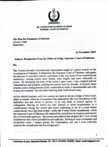 جسٹس منصور علی شاہ نے اپنے استعفے میں 27ویں آئینی ترمیم کو “آئینِ پاکستان پر سنگین حملہ” قرار دیتے ہوئے لکھا کہ اس ترمیم نے سپریم کورٹ کو تقسیم اور عدلیہ کو حکومت کے ماتحت کر دیا ہے.
