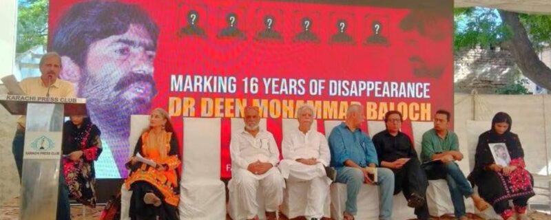 کراچی (رپورٹ: امام بخش) معروف سماجی کارکن سمی دین بلوچ کے والد اور سرکاری ڈاکٹر دین محمد بلوچ کی جبری گمشدگی کو 16 سال مکمل ہونے پر کراچی پریس کلب میں ایک سیمینار کا انعقاد کیا گیا۔ سیمینار میں سول سوسائٹی، انسانی حقوق کی تنظیموں، صحافیوں اور سیاسی کارکنوں کی بڑی تعداد نے شرکت کی، جب کہ دوران سیمینار پریس کلب کے باہر پولیس کی بھاری نفری تعینات رہی۔