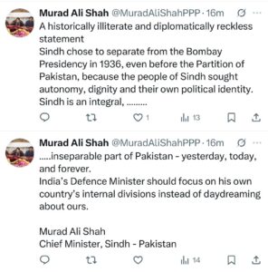 وزیراعلیٰ سندھ نے اپنی ایکس (X) پوسٹ میں کہا کہ بھارتی وزیرِ دفاع تاریخ سے ناواقف ہیں۔ سندھ نے تو قیامِ پاکستان سے بھی پہلے، سال 1936 میں بمبئی پریذیڈنسی سے علیحدگی اختیار کرکے اپنی الگ شناخت قائم کی تھی۔ سندھ کے عوام نے ہمیشہ اپنی خودمختاری، وقار اور سیاسی شناخت کو ترجیح دی ہے۔