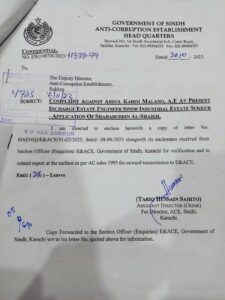 شکایت میں یہ بھی کہا گیا ہے کہ کیرتھر کینال پر قائم واٹر پمپنگ اسٹیشن کی مشینری اور مینٹیننس کے نام پر نامزد انجینئر نے اپنے بھتیجے عبدالوحید ملانو کو سرکاری کنٹریکٹر ظاہر کر کے ہر تین ماہ بعد لاکھوں روپے جاری کرائے۔ اس کے علاوہ سکھر سائٹ چوک میں صنعتی اراضی پر مرحوم والد کے نام پر چار دکانوں سمیت چھ دکانیں تعمیر کر کے کمرشل بنیادوں پر کرائے پر دی گئیں، جن کی سب لیٹنگ فیس سرکاری خزانے میں جمع نہیں کرائی جا رہی۔